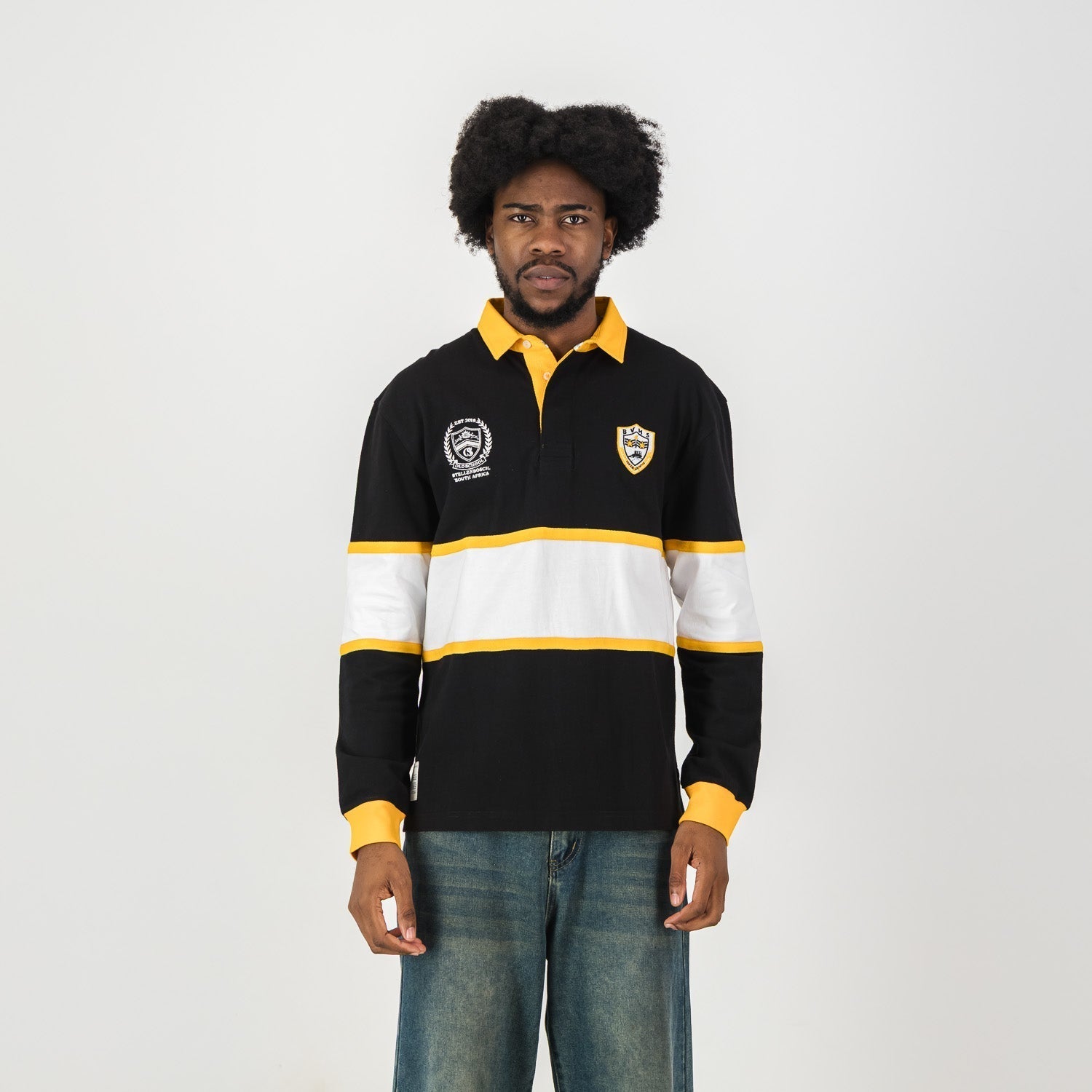 Show your school spirit with the Voortrekker Bethlehem Rugby Jersey, a true classic for any dedicated supporter. This long-sleeve jersey sports a striking black design, accented with bold white and yellow chest stripes and a vibrant yellow collar. Dual embroidered crests proudly display the school's heritage, making it a standout piece. Crafted from heavyweight cotton, it offers superb comfort and durability for game day or everyday wear.