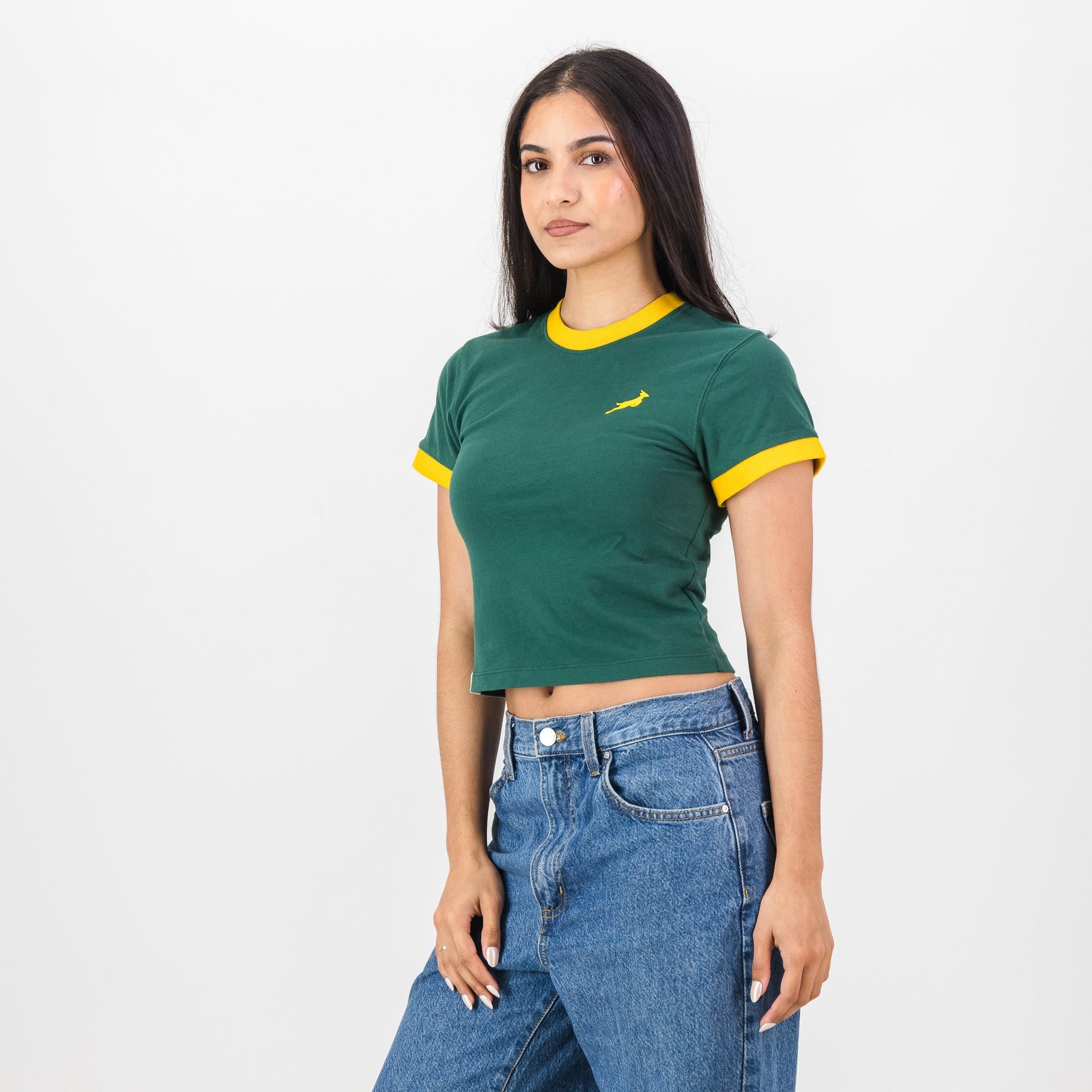 Official Springboks Women's Green Ringer Crop Crew Neck Rugby Tee Top