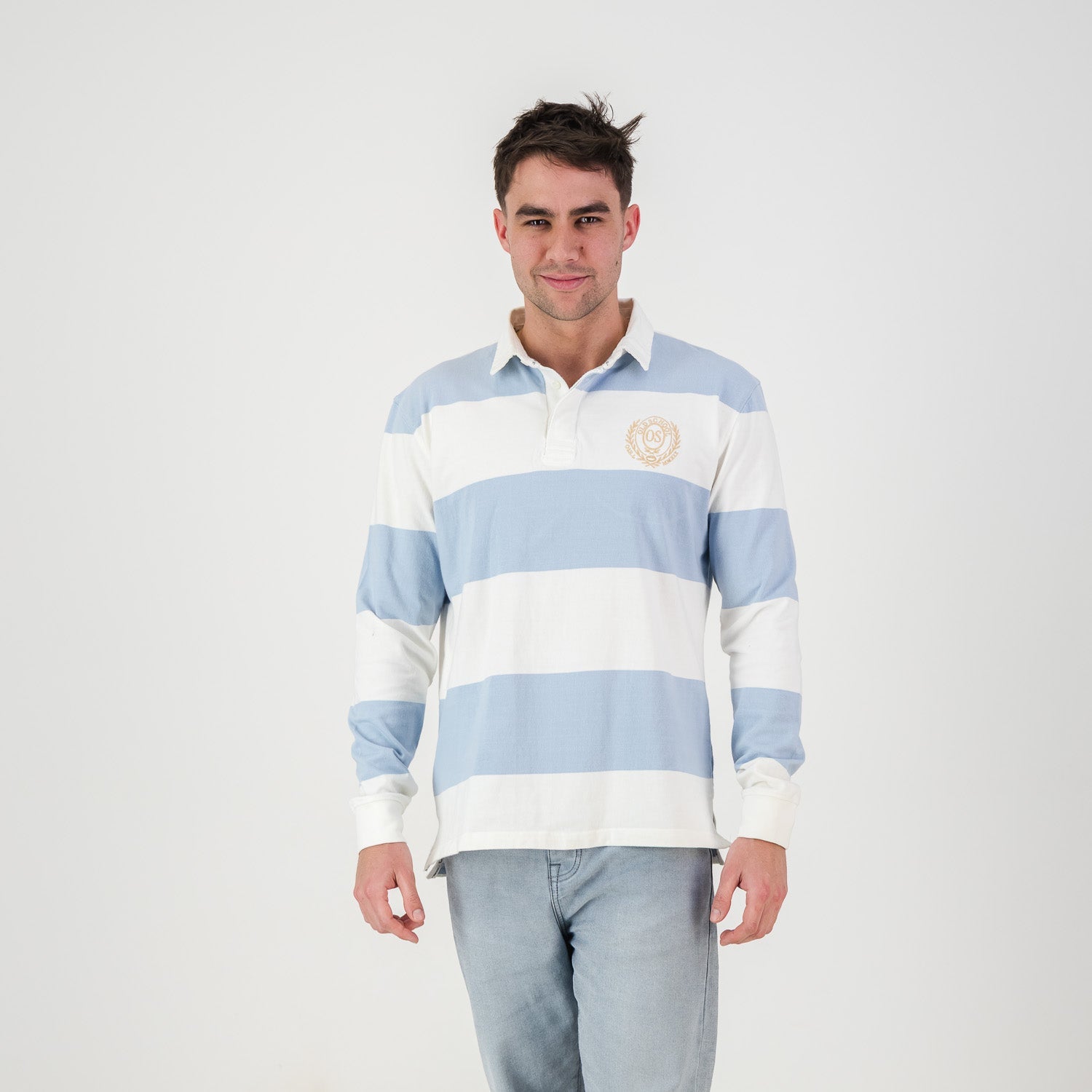 Step into classic cool with this Old School heavyweight rugby jersey, a true timeless icon. It boasts bold Cloud Dancer and Sky Blue stripes on a durable cotton knit, delivering that perfect structured feel. A classic rugby collar and premium OS laurel crest embroidery add a refined touch of heritage. This jersey ensures you look effortlessly stylish for any occasion.